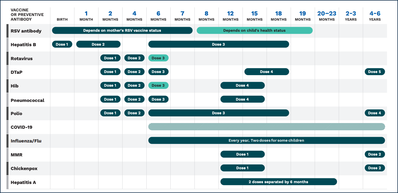 - Hepatitis A & B: Multi-dose series starting at birth (Hep B) and age 1 (Hep A).