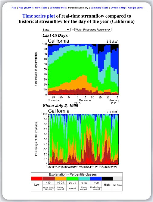 The USGS Percent Summary uses a stacked-area chart to show the exact proportion of California’s streamgages falling into specific flow categories. This visualization is critical for seeing how much of the state is currently experiencing "Normal" versus extreme conditions.