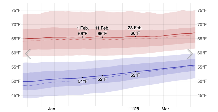 - Daytime Temperatures: Highs average 66°F early in the month and climb slightly to 67°F by the end of February.